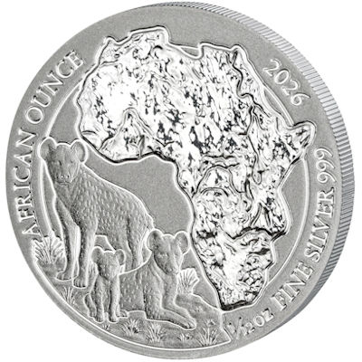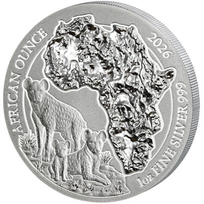 Die 2026 Ausgabe der Ruanda African Silver Ounce zeigt das Motiv Tüpfelhyäne. Wie üblich zieren im Vordergrund die Tiere das Motiv und im Hintergrund befindet sich der afrikanische Kontinent. Die Stempelglanz Prägung ist unlimitiert, wird aber nur im Ausgabejahr produziert. Die Münze besteht aus 1 Oz Feinsilber in der Prägequalität Stempelglanz/Brilliant Uncirculated und wird einzeln verschweißt verausgabt.