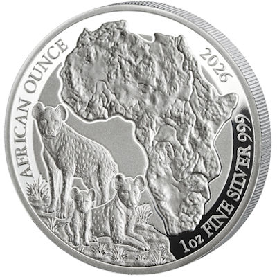 Die 2026 Ausgabe der Ruanda African Silver Ounce zeigt das Motiv Tüpfelhyäne. Wie üblich zieren im Vordergrund die Tiere das Motiv und im Hintergrund befindet sich der afrikanische Kontinent. Die Stempelglanz Prägung ist unlimitiert, wird aber nur im Ausgabejahr produziert. Die Münze besteht aus 1/12 Oz Feinsilber in der Prägequalität Stempelglanz/Brilliant Uncirculated und wird einzeln verschweißt verausgabt.