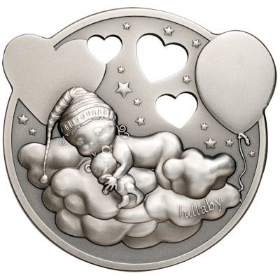Diese wunderschöne Lullaby (Wiegenlied) Münze zeigt ein schlafendes Kind auf einer Wolke mit Herzen und Luftballon im Hintergrund. Als besonderes Highlight dieser im SmartMinting Verfahren geprägter Münze sind einige Herzen ausgenommen. Das mitgelieferte Etui ist nicht nur einfach ein Etui sondern zudem eine Spieluhr die das bekannte Guten Abend Gut Nacht spielt, basierend auf dem Wiegenlied von Johannes Brahms, im englischen als Lullaby bekannt, daher der Titel dieser Münze. Die Münze selbst besteht aus 1 Oz Feinsilber in AntikFinish veredelt und das Set ist auf nur 999 Stück weltweit limitiert. Die Vorgängerversion in Blau (für Buben) war beim Hersteller innerhalb kürzester Zeit ausverkauft. Diese Ausgabe ist in Rosa gehalten und richtet sich primär an Mädchen. |