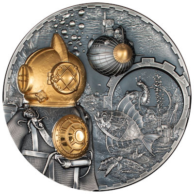 Mit dieser beeindruckenden 1 Kilo Feinsilbermünze tauchen wir tief ein in die fantastische Unterwasserwelt, bekannt aus Jules Vernes 20.000 Meilen unter dem Meer. Nachdem wir die legendäre Nautilus in Tiefseetauchausrüstung zurückgelassen haben, begegnen wir riesigen Meeresschnecken, Schildkröten, Kraken und Schiffswracks. Natürlich stoßen wir auch auf den Serien Stammgast, den Hochradfahrer.