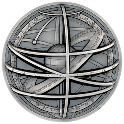 Die Armillarsphäre, die 2. Ausgabe der Reihe Historische Instrumente, ist ein frühes Wunderwerk astronomischer Genialität. In seiner komplexen Form erfasst dieses bemerkenswerte Gerät auf elegante Weise Himmels- und Erdkreise. Mit der Erde im Mittelpunkt ist dieser Himmelsglobus mit Gradangaben für Winkelmessungen ausgestattet. Im 17. und 18. Jahrhundert schmückten solche prächtigen Geräte die Salons der Akademiker, entweder schwebend, auf kunstvollen Ständern oder an einem eleganten Griff gehalten. Die Armillarsphäre wurde angeblich getrennt im alten China im 4. Jahrhundert v. Chr. und im antiken Griechenland im 3. Jahrhundert v. Chr. erfunden. Die 2 Oz Feinsilbermünze wurde aufwendig gestaltet und in Antik Finish im Smartminting(R) Verfahren geprägt. Die Auflage beträgt nur 1.500 Stück weltweit. |