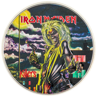 Realitätsgetreu präsentieren wir das Albumcover von Iron Maidens zweitem Album «Killers» von 1981. Der düstere Eddie auf dem Cover, eine blutige Axt über seinem Opfer schwingend, ist eine bestechende visuelle Interpretation für den Titel des musikalischen Meisterwerks. Dieses zweite Album war ein bedeutender Wendepunkt für Iron Maiden. Es war das letzte Album mit ihrem damaligen Sänger Paul Di’Anno, der noch während der laufenden Tour durch den heutigen Frontmann Bruce Dickinson ersetzt wurde. Die Auflage der Münze ist weltweit auf nur 1.981 Stück streng limitiert. |