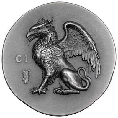 Begleitet wird der Greif von der Zikade, die als beliebtes Zusatzmotiv auf zahlreichen antiken Geldstücken zu finden ist. Die Chiffren CI ahmen die Tradition antiker griechischer Prägungen nach, den Ursprung der Münze zu kennzeichnen.