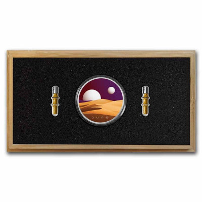 - Set-Features: Das Spice-Set enthält zwei Fläschchen mit insgesamt 1/10 oz .9999 Feingoldkörner, die das wertvolle Spice aus Dune symbolisieren. Das Set enthält auch eine exklusive farbige 1 Oz Silber Medaille, die die Landschaft des Planeten Arrakis zeigt.
