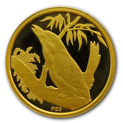 Es handelt sich hier um eine Kookaburra Prägung aus dem 20 Jahre Gedenkset mit einem Feingewicht von 1/20 Oz Feingold und einem Nennwert von 5 Dollar. die Münze besteht aus 999er Feingold. Das Motiv zeigt den Kookaburra der ursprünglich 1992 verwendet wurde. Alle Motive aus diesem Set tragen die Jahreszahl 2009, in dem das Jubiläumsset erschienen ist, mit einer Auflage von nur 2.009 Stück. |