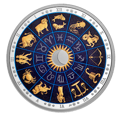Was ist ihr Sternzeichen? Die 12 Tierkreiszeichen (und ihre entsprechenden Glyphen) besetzen jeweils einen 30-Grad-Ausschnitt des Nachthimmels auf dieser 2 Oz schweren Feinsilbermünze. Auf der Rückseite Ihrer Münze verleiht die Metallic-Farbe den tiefen Farbtönen und gravierten Illustrationen, die das Mysterium und den Reiz des Tierkreises einfangen, einen faszinierenden Schimmer. Die 12 Tierkreissymbole sind alle von den Konstellationen abgeleitet, den Sternen, die einen Gürtel über den Himmel und diese Münze bilden, wo die himmlischen Muster verborgen bleiben, bis sie unter einem Schwarzlicht (im Lieferumfang enthalten) betrachtet werden.