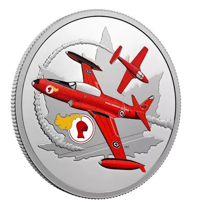 Von 1958 bis 1969 begeisterten die Red Knight Zuschauer in ganz Kanada und den Vereinigten Staaten mit beeindruckenden Kunstflugvorführungen. Diese Flugzeuge in ikonischem rot lackiert, zusammen mit dem unverwechselbaren Ritterhelm-Emblem, wurden auf dieser Silbermünze farbenfroh nachgebildet.