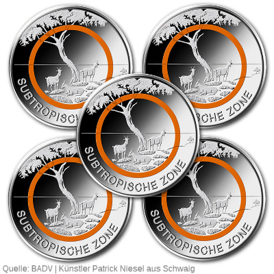 Es handelt sich hier um die 2. Ausgabe Subropische Zone in der Prägequalität Stempelglanz. Besonderheit, jede Prägestätte benutzt einen anderen Orangeton für den Polymerring. Das Bildmaterial ist Copyright (c) bei BADV, Der Entwurf der Bildseite stammt von dem Künstler Patrick Niesel aus Schwaig. Die Wertseite, die für alle Münzen der Serie verwendet wird, wurde von der Künstlerin Stefanie Radtke aus Leipzig gestaltet. |