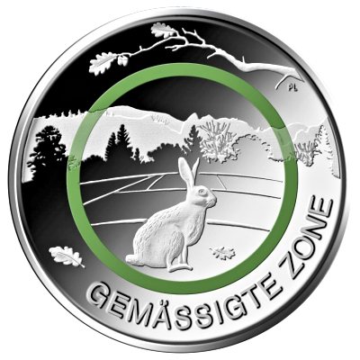 Es handelt sich hier um die 3. Ausgabe Gemässigte Zone in der Prägequalität Stempelglanz. Besonderheit, jede Prägestätte benutzt einen anderen Grünton für den Polymerring. Das Bildmaterial ist Copyright (c) bei BADV. Die Wertseite, die für alle Münzen der Serie verwendet wird, wurde von der Künstlerin Stefanie Radtke aus Leipzig gestaltet. |