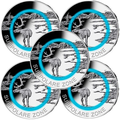Es handelt sich hier um die 4. Ausgabe Subpolare Zone als Komplettsatz mit allen Prägebuchstaben in der Prägequalität Spiegelglanz. Besonderheit, jede Prägestätte benutzt einen anderen Blauton für den Polymerring. Die Auslieferung erfolgt in der Original-Verpackung, also im Set 5 Boxen mit 5 Münzen mit allen 5 Prägeanstalten. Das Bildmaterial ist Copyright (c) bei BADV. Die Wertseite, die für alle Münzen der Serie verwendet wird, wurde von der Künstlerin Stefanie Radtke aus Leipzig gestaltet. |