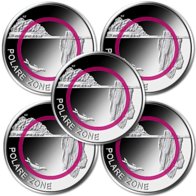 Es handelt sich hier um die 5. Ausgabe Polare Zone in der Prägequalität Stempelglanz. Besonderheit, jede Prägestätte benutzt einen anderen Grünton für den Polymerring. Das Bildmaterial ist Copyright (c) bei BADV. Die Wertseite, die für alle Münzen der Serie verwendet wird, wurde von der Künstlerin Stefanie Radtke aus Leipzig gestaltet. |