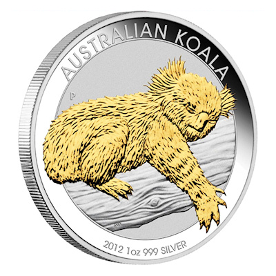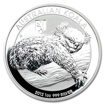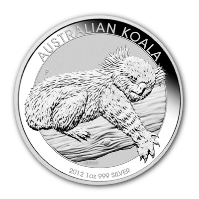 Die 2012er Ausgabe der Australischen Anlagemünze Koala in 999/1000 Feinsilber geprägt und einzeln gekapselt. |