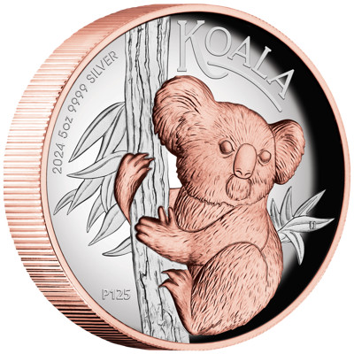 Australien - 8 AUD Koala 2024 - 5 Oz Silber HighRelief Gilded | ||