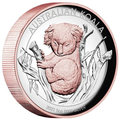 Australien - 8 AUD Koala 2021 - 5 Oz Silber HighRelief Gilded | ||