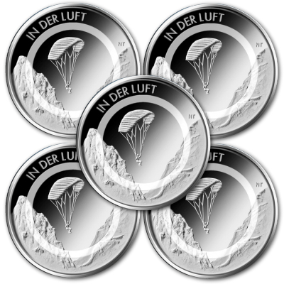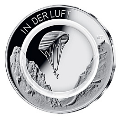 Die Bundesregierung hat beschlossen, eine 10-Euro-Sammlermünze „In der Luft“ mit einem farblosen Kunststoffring prägen zu lassen und sie am 4. April 2019 auszugeben. Die Münze bildet den Auftakt einer dreiteiligen Serie „Luft bewegt“ (2019 - 2021, eine Ausgabe pro Jahr) und schließt damit thematisch an die Ausgabe der 5-Euro-Münzen „Planet Erde“ und „Klimazonen der Erde“ an, die in den vergangenen zwei Jahren mit großem Erfolg vom Bund emittiert wurden. Die 10-Euro-Münze „In der Luft“ besteht aus zwei verschiedenen Kupfer-Nickel-Legierungen sowie einem lichtdurchlässigen Kunststoffring. Sie hat eine Masse von 9,8 Gramm und wird in den beiden Prägequalitäten Stempelglanz und Spiegelglanz hergestellt. Der Entwurf der Bildseite stammt von der Künstlerin Natalie Tekampe aus Müncheberg. Die Wertseite, die bei allen Münzen der Serie identisch ist, wurde von dem Künstler Andre Witting aus Berlin gestaltet. Die Bildseite zeigt einen Gleitschirm, der im Zentrum der Darstellung steht und in einer Gebirgslandschaft fliegt. So kommen die Freiheit und die Freude des Fliegens in der Natur hervorragend zur Geltung. Die Gestaltung der Wertseite passt zu der ausgewählten Bildseite. Sie zeigt einen Adler in der Fläche eines freien Raumes, den Schriftzug „BUNDESREPUBLIK DEUTSCHLAND“, Wertziffer und Wertbezeichnung, die Jahreszahl 2019, die zwölf Europasterne sowie - je nach Prägestätte - das Münzzeichen „A“ (Berlin), „D“ (München), „F“ (Stuttgart), „G“ (Karlsruhe) oder „J“ (Hamburg). Der glatte Münzrand enthält in vertiefter Prägung die Inschrift: LUFT BEWEGT |