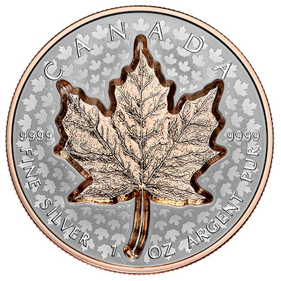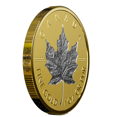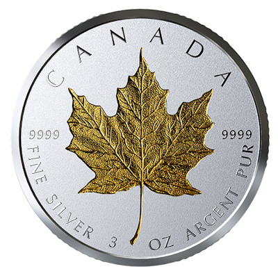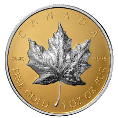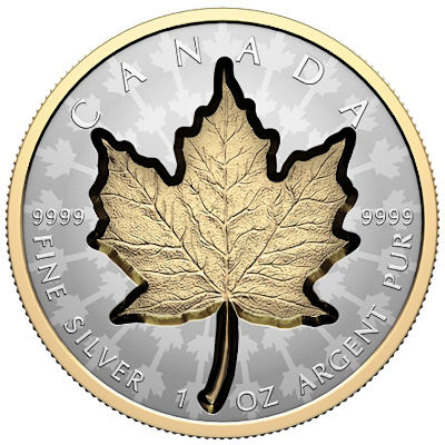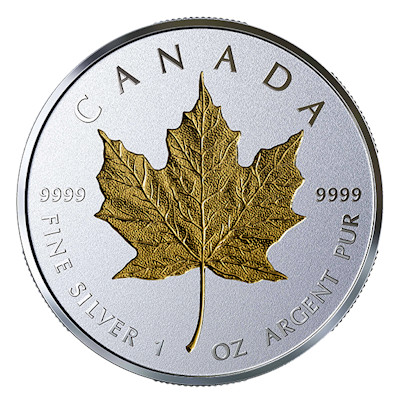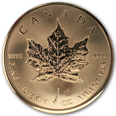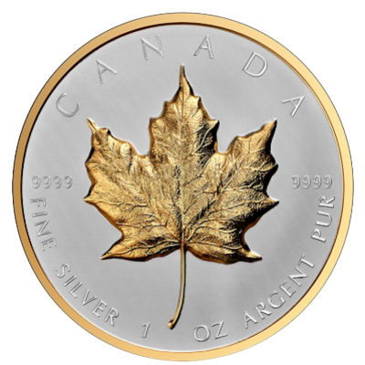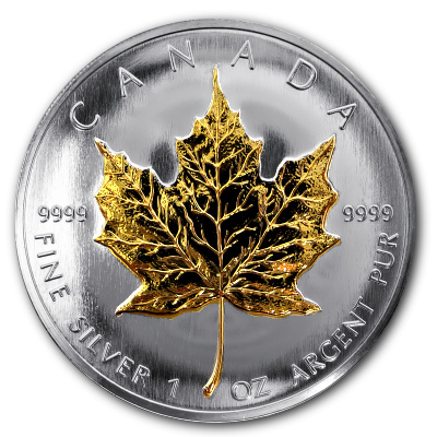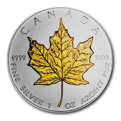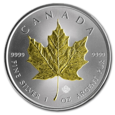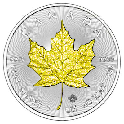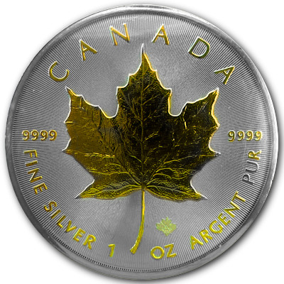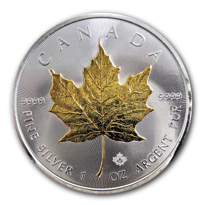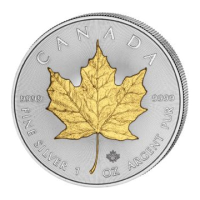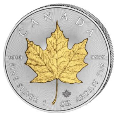 Es handelt sich hier um die 1 Oz Feinsilber Anlagemünze der Royal Canadian Mint den Maple Leaf, in der Variante 24-Karat vergoldet. |