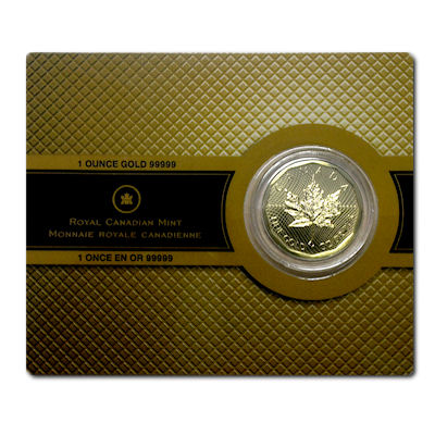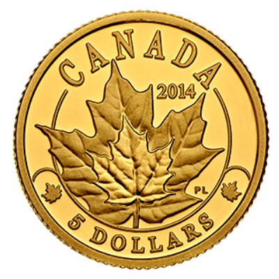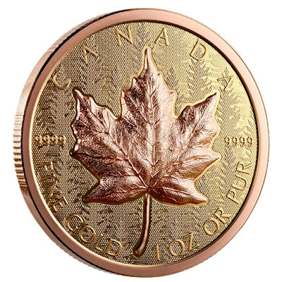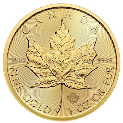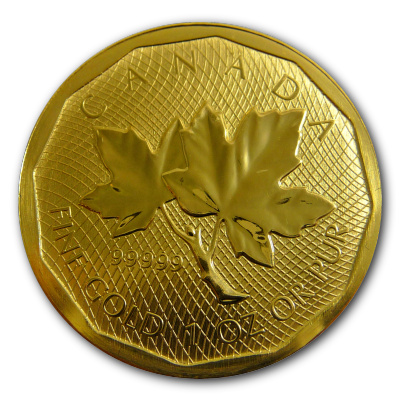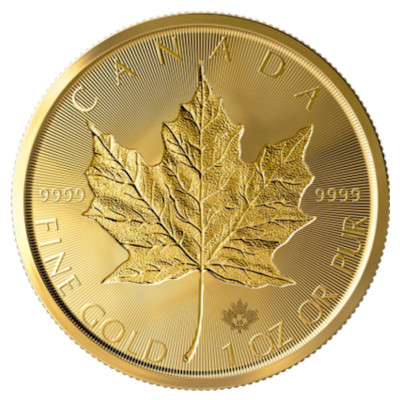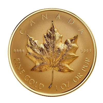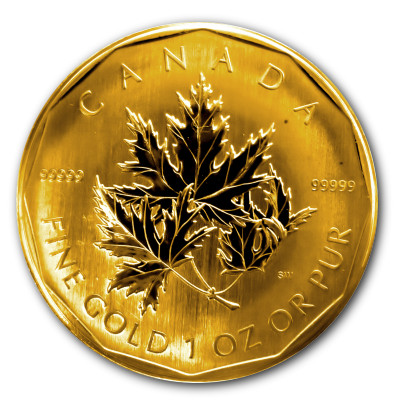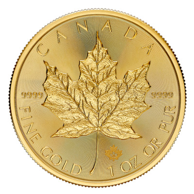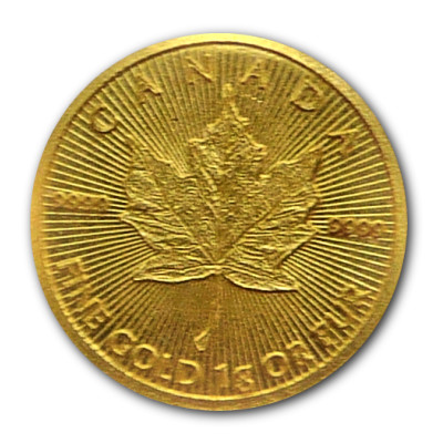 Die berühmte Maple Leaf Goldmünze geprägt von der Royal Canadian Mint (Kanada) mit einem Feingewicht von 1 Gramm in der hohen Reinheit 99,99%. |
