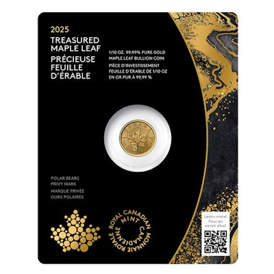 Es handelt sich hier um die 2025er Ausgabe des weltbekannten Maple Leaf in 1/10 Oz Feingold mit den neuesten Sicherheitsmerkmalen der Royal Canadian Mint und dem Zusatz Privy Eisbär. |