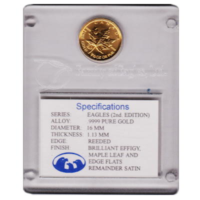 Es handelt sich hier um einen Maple Leaf in 1/10 Oz Feingold in der Reinheit 9999 mit dem Privy Mark Eagles (2nd. Edition). Die Münze ist in einer Kunststoffbox gekapselt mit enthaltenem Zertifikat. |