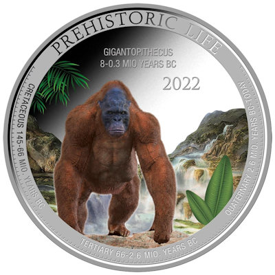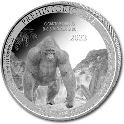 Mit der 7. Ausgabe Gigantopithecus wird die Serie Prähistorisches Leben fortgesetzt. Die Münze ist aus reinstem 9999er Feinsilber in der höchsten Prägequalität Stempelglanz geprägt und auf jeweils nur 10.000 Stück weltweit streng limitiert. Die Auslieferung erfolgt einzeln gekapselt. Die Ausgabe ist beim Hersteller bereits komplett ausverkauft und musste zugeteilt werden. |