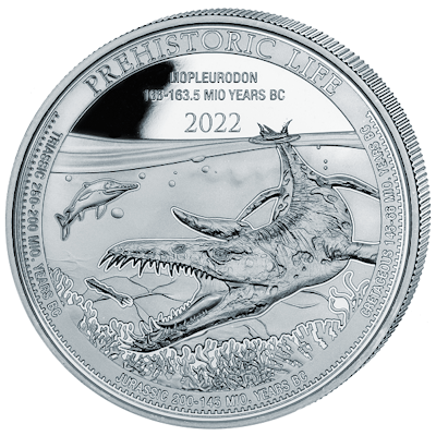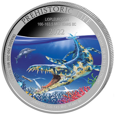 Mit der 8. Ausgabe Liopleurodon wird die Serie Prähistorisches Leben fortgesetzt. Die Münze ist aus reinstem 9999er Feinsilber in der höchsten Prägequalität Stempelglanz geprägt und auf jeweils nur 10.000 Stück weltweit streng limitiert. Die Auslieferung erfolgt einzeln gekapselt. Die Ausgabe ist beim Hersteller bereits komplett ausverkauft und musste zugeteilt werden. |