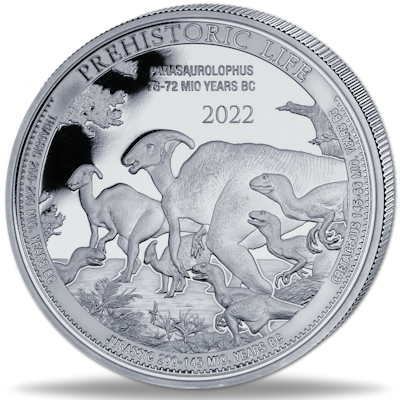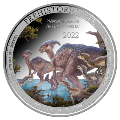 Mit der 9. Ausgabe Parasaurolophus wird die Serie Prähistorisches Leben fortgesetzt. Die Münze ist aus reinstem 9999er Feinsilber in der Prägequalität Stempelglanz geprägt und auf jeweils nur 10.000 Stück weltweit streng limitiert. Die Auslieferung erfolgt einzeln gekapselt. Die Ausgabe ist beim Hersteller bereits komplett ausverkauft und musste zugeteilt werden. |