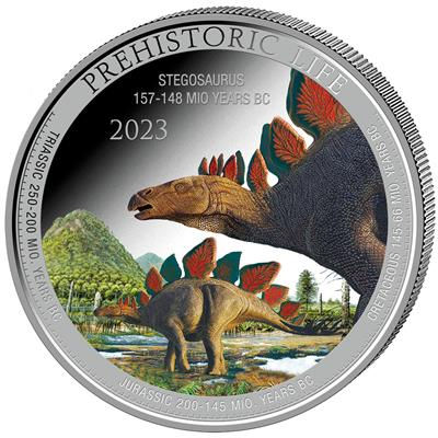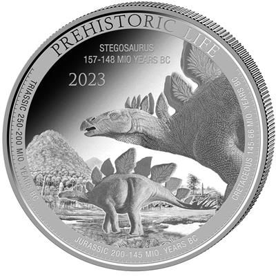 Mit der 12. Ausgabe Stegosaurus wird die Serie Prähistorisches Leben beendet. Die Münze ist aus reinstem 9999er Feinsilber in der Prägequalität Stempelglanz geprägt und aufwendig coloriert. Die Auflage ist auf nur 2.000 Stück weltweit streng limitiert. Die Auslieferung erfolgt einzeln gekapselt. |