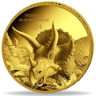 Dies ist die erste Ausgabe der zweiten Serie Prähistorisches Leben und zeigt den Triceratops. Die Münze ist aus reinstem 9999er Feingold in der Prägequalität Polierte Platte geprägt und auf jeweils nur 2.000 Stück weltweit streng limitiert. Die Auslieferung erfolgt einzeln gekapselt. |