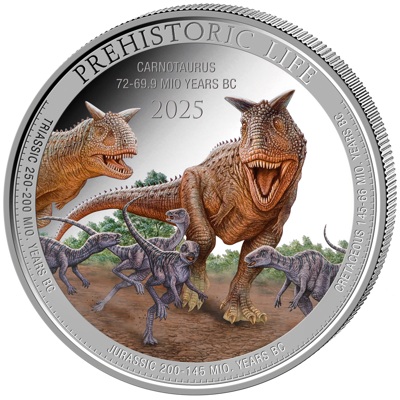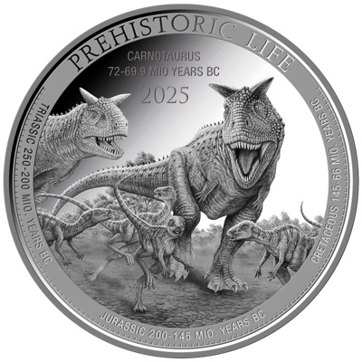 Dies ist die vierte Ausgabe der zweiten Serie Prähistorisches Leben und zeigt den Carnotaurus. Die Münze ist aus reinstem 9999er Feinsilber in der Prägequalität Stempelglanz geprägt und auf nur 10.000 Stück weltweit streng limitiert. Die Auslieferung erfolgt einzeln gekapselt. |