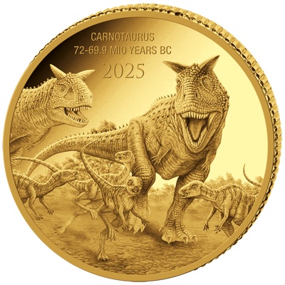 Dies ist die vierte Ausgabe der zweiten Serie Prähistorisches Leben und zeigt den Carnotaurus. Die Münze ist aus reinstem 9999er Feingold in der Prägequalität Polierte Platte geprägt und auf nur 2.000 Stück weltweit streng limitiert. Die Auslieferung erfolgt einzeln gekapselt. |