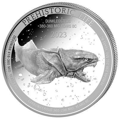 Mit der 11. Ausgabe Dunkleosteus wird die Serie Prähistorisches Leben fortgesetzt. Die Münze ist aus reinstem 9999er Feinsilber in der Prägequalität Stempelglanz geprägt und auf jeweils nur 10.000 Stück weltweit streng limitiert. Die Auslieferung erfolgt einzeln gekapselt. |