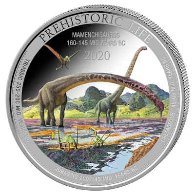 Mit der 3. Ausgabe Mamenchisaurus wird die Serie Prähistorisches Leben fortgesetzt. Die Münze ist aus reinstem 9999er Feinsilber in der höchsten Prägequalität Stempelglanz geprägt und auf jeweils nur 10.000 Stück weltweit streng limitiert. Die Auslieferung erfolgt einzeln gekapselt. Die Ausgabe ist beim Hersteller bereits komplett ausverkauft und musste zugeteilt werden. |