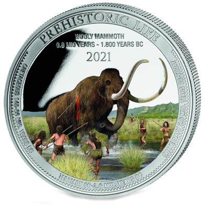 Mit der 4. Ausgabe Wollmammut wird die Serie Prähistorisches Leben fortgesetzt. Die Münze ist aus reinstem 9999er Feinsilber in der höchsten Prägequalität Stempelglanz geprägt und auf jeweils nur 10.000 Stück weltweit streng limitiert. Die Auslieferung erfolgt einzeln gekapselt. Die Ausgabe ist beim Hersteller bereits komplett ausverkauft und musste zugeteilt werden. |