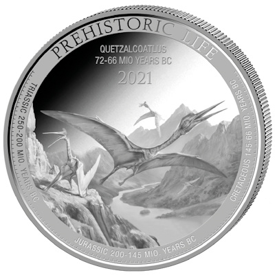 Mit der 6. Ausgabe Quetzalcoatlus wird die Serie Prähistorisches Leben fortgesetzt. Die Münze ist aus reinstem 9999er Feinsilber in der höchsten Prägequalität Stempelglanz geprägt und auf jeweils nur 10.000 Stück weltweit streng limitiert. Die Auslieferung erfolgt einzeln gekapselt. Die Ausgabe ist beim Hersteller bereits komplett ausverkauft und musste zugeteilt werden. |
