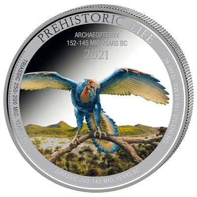 Mit der 5. Ausgabe Archaeopteryx wird die Serie Prähistorisches Leben fortgesetzt. Die Münze ist aus reinstem 9999er Feinsilber in der höchsten Prägequalität Stempelglanz geprägt und auf jeweils nur 10.000 Stück weltweit streng limitiert. Die Auslieferung erfolgt einzeln gekapselt. Die Ausgabe ist beim Hersteller bereits komplett ausverkauft und musste zugeteilt werden. |