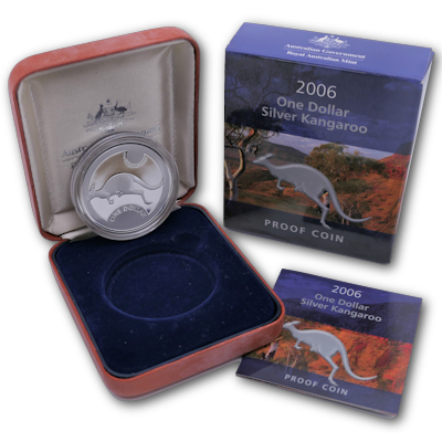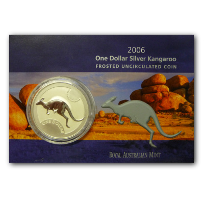 One Dollar Silver Kangaroo - Ausgabe 2006, verpackt im Original-Blister der Royal Australian Mint. |