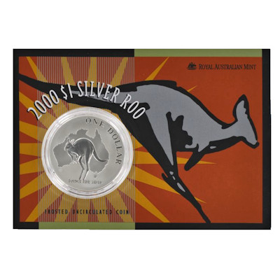 One Dollar Silver Kangaroo - Ausgabe 2000, verpackt im Original-Blister der Royal Australian Mint. |