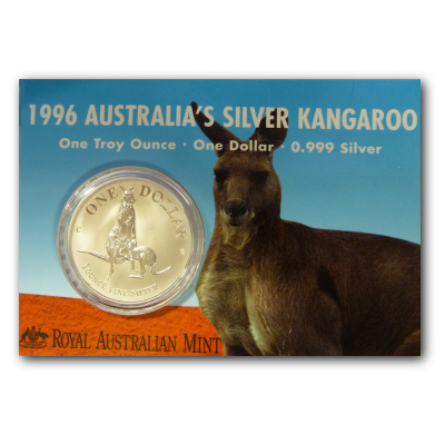 One Dollar Silver Kangaroo - Ausgabe 1996, verpackt im Original-Blister der Royal Australian Mint. |