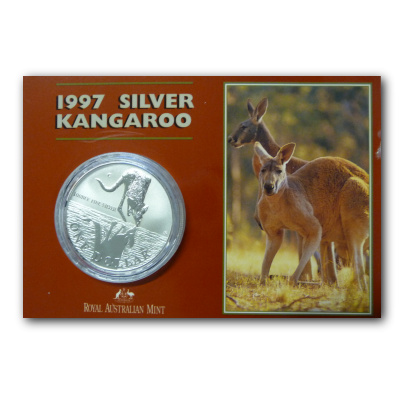 One Dollar Silver Kangaroo - Ausgabe 1997, verpackt im Original-Blister der Royal Australian Mint. |