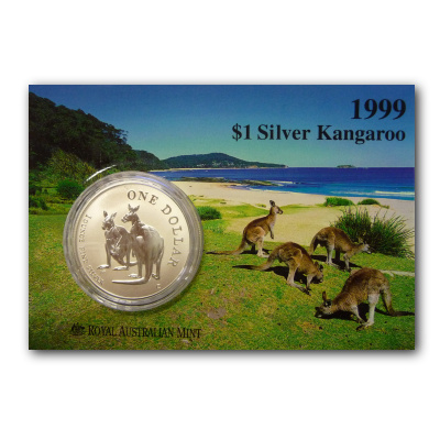 One Dollar Silver Kangaroo - Ausgabe 1999, verpackt im Original-Blister der Royal Australian Mint. |