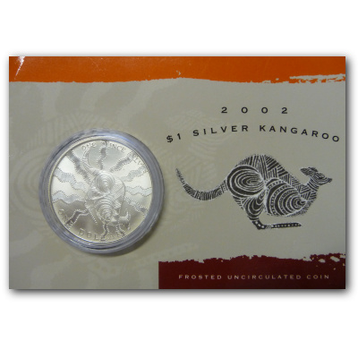 One Dollar Silver Kangaroo - Ausgabe 2002, verpackt im Original-Blister der Royal Australian Mint. |