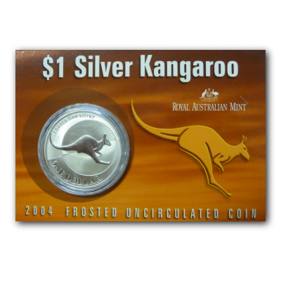 One Dollar Silver Kangaroo - Ausgabe 2004, verpackt im Original-Blister der Royal Australian Mint. |