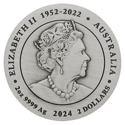 Technische Daten: Ausgabeland: Australien Prägeanstalt: The PerthMint Australia Ausgabejahr: 2024 Nennwert: 2 AUD Material: Silber Gewicht: 62,20600g Durchmesser: 40,69 mm Dicke: 5,86 mm Auflage: 1.888 Stück Prägequalität: Antik Finish Verpackung: Im Original-Aufsteller mit Umverpackung und Echtheitszertifikat |