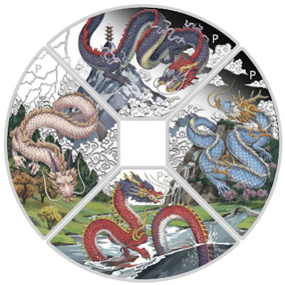 Es handelt sich hier um das 4er Quadrant Set zum Jahr des Drachen, ausgegeben von Tuvalu und produziert von der The Perth Mint Australia. Die aufwendig colorierten Formmünzen kommen in der höchsten Prägequalität Polierte Platte, sind aufwendig coloriert und auf nur 1.500 Stück weltweit limitiert. Die sich ergebene Form erinnert an frühere chinesische Zahlungsmittel.