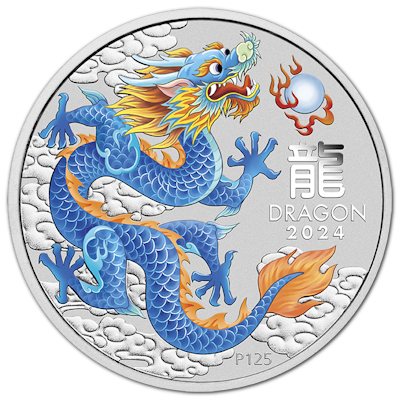 Von der PerthMint Australia kommt die Lunar III Ausgabe mit dem Motiv des Drachen in 1 Oz Feinsilber in der Prägequalität Stempelglanz, aufwendig coloriert in der Farbe Blau. Die Münze wird einzeln gekapselt ausgeliefert.