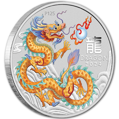 Von der PerthMint Australia kommt die Lunar III Ausgabe mit dem Motiv des Drachen in 1 Oz Feinsilber in der Prägequalität Stempelglanz, aufwendig coloriert in der Farbe Golden. Die Münze wird einzeln gekapselt ausgeliefert.