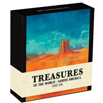 Es handelt sich hier um die 3. Ausgabe der Serie Treaures of the World und widmet sich dem nordamerikanischen Kontinent. In die in höchster Prägequalität Polierte Platte produzierte Münze sind jeweils Bodenschätze die typisch für den jeweiligen Kontinent sind eingeschlossen. So beinhaltet diese Ausgabe einen echten Turquoise Edelstein. Die Münze ist streng limitiert auf nur 7.500 Stück weltweit und erfreut sich großer Beliebtheit. Die Serie erscheint jährlich.