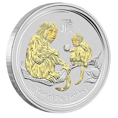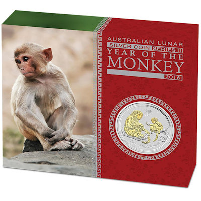 Der Lunar II Affe in 1 Oz Feinsilber, stempelglanz, edel vergoldet, mit Original-Etui der Perth Mint Australia, Umverpackung im Seriendesign und nummeriertem Echtheitszertifikat!