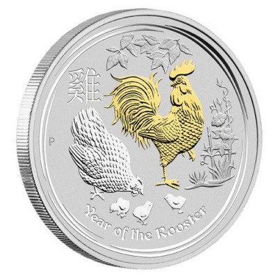 Der Lunar II Hahn in 1 Oz Feinsilber, stempelglanz, edel vergoldet in 24-Karat, mit Original-Etui der Perth Mint Australia, Umverpackung im Seriendesign und nummeriertem Echtheitszertifikat!