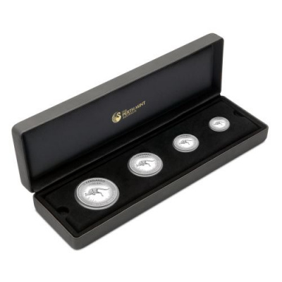 Es handelt sich hier um die 2017er Ausgabe der neuen Känguru Silber Anlagemünze von der Perth Mint Australia als 4-Coin Silber Proof Set mit den Größen 1/10 Oz, 1/4 Oz, 1/2 Oz und 1 Oz. Alle Münzen sind in der hohen Reinheit 99,99% Silber sowie in der höchsten Prägequalität Polierte Platte geprägt. Die Münzen sind auf nur 3.000 Stück weltweit streng limitiert. Die Auslieferung erfolgt im Original-Etui mit Umverpackung und nummeriertem Echtheitszertifikat.